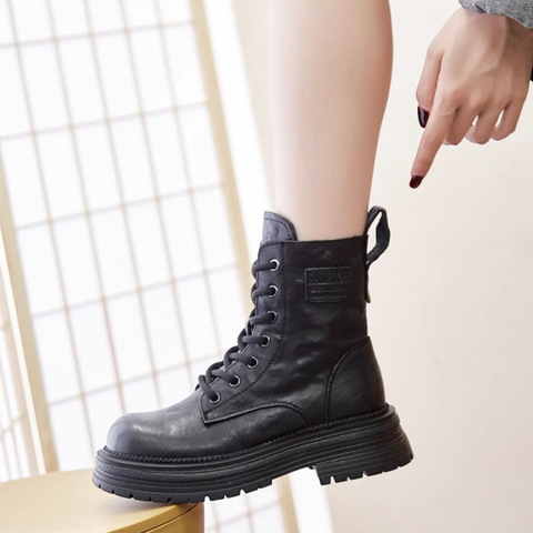 Gon22 Bottes de neige en cuir de vachette à semelle épaisse confortables pour femmes Hiver et Automne avec doublure polaire et coton chaud Non